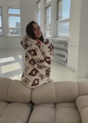 Its creamy base colour with geometric, boho-inspired patterns in shades of beige and brown adds character, charm and a touch of ethnic elegance. The loose, oversized fit ensures full freedom of movement, while the wide sleeves and spacious hood wrap you in warmth and comfort. The knee-length design allows you to snuggle in completely and enjoy true relaxation.