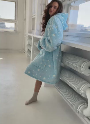 Its light blue colour with a pattern of glow-in-the-dark stars creates a dreamy, whimsical atmosphere that turns every evening into something special. The loose, oversized fit allows for full freedom of movement, while the wide sleeves and roomy hood wrap you in warmth and plush comfort. The knee-length design provides full-body coverage, keeping you perfectly cosy even on the coldest days.
